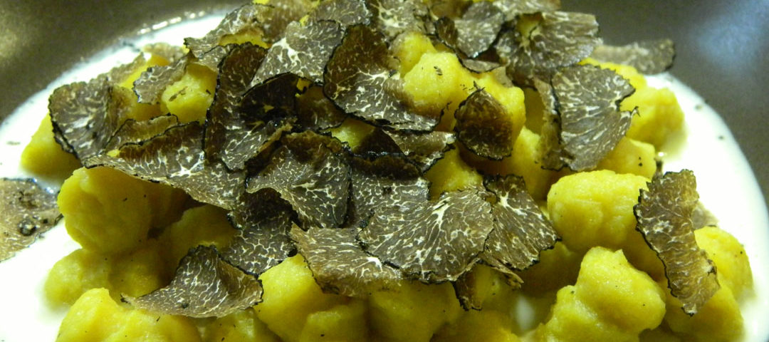 In una padella saltare gli gnocchi con un po' di fonduta e una grattugiata di tartufo nero (il tartufo nero sprigiona più gusto se grattugiato finemente e cotto).